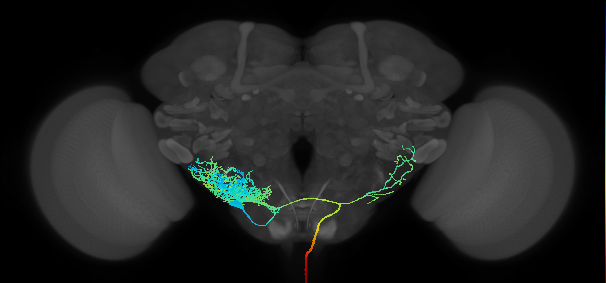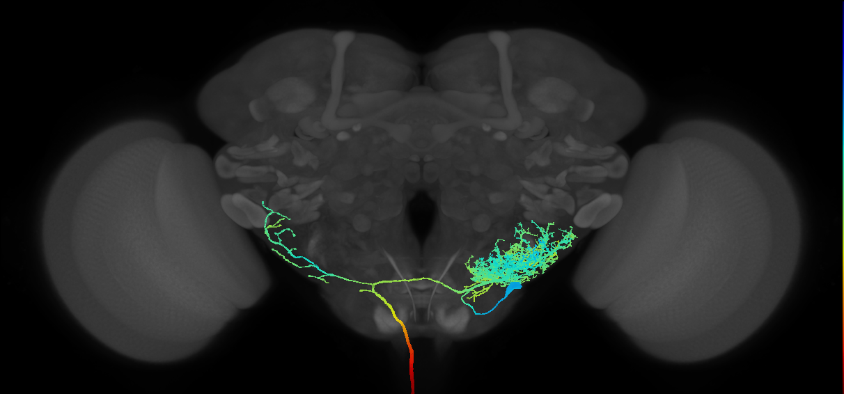 - has synaptic IO in region: adult gnathal ganglion, antennal mechanosensory and motor center, anterior ventrolateral protocerebrum, lower tectulum, wedge